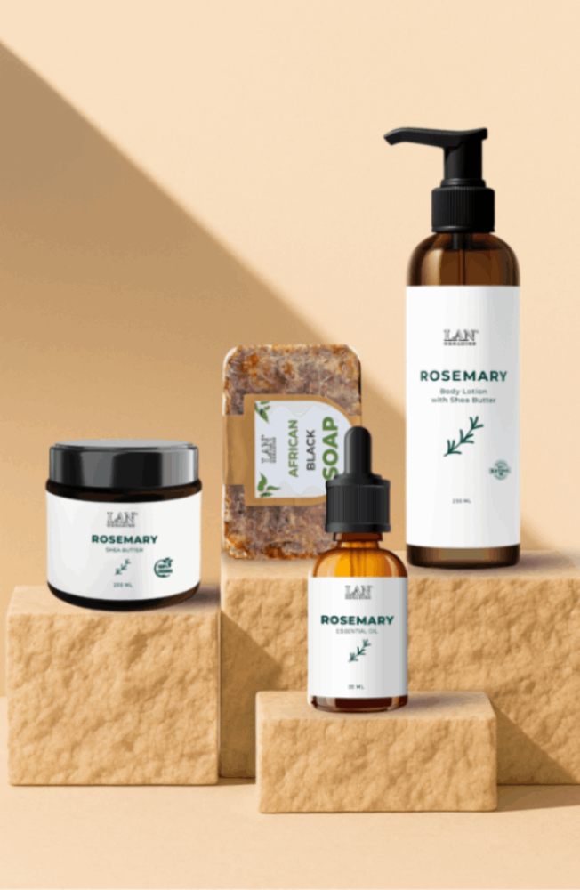 - زيت إكليل الجبل الأساسي: امزجي 2-3 قطرات مع ملعقة صغيرة من زيت ناقل (مثل زيت اللوز أو الجوجوبا) ودلكي به الجسم لتهدئة البشرة أو فروة الرأس لتحسين صحة الشعر. يمكن خلطه مع زبدة الشيا لتعزيز الترطيب العميق للمناطق الجافة.